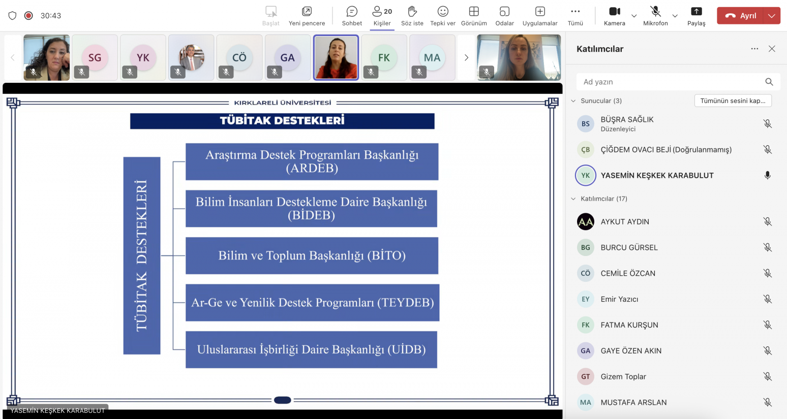 Kırklareli Üniversitesi Proje Geliştirme ve Koordinasyon Ofisi tarafından, 23 Eylül 2025 Salı günü 14:00-16:00 saatleri arasında “TÜBİTAK-BİDEB Bilim İnsanı Destekleme Programları Genel Bilgilendirme Günü Etkinliği”, Microsoft Teams platformu üzerinden üniversitemiz öğretim elemanlarının katılımıyla çevrim içi olarak gerçekleştirildi.