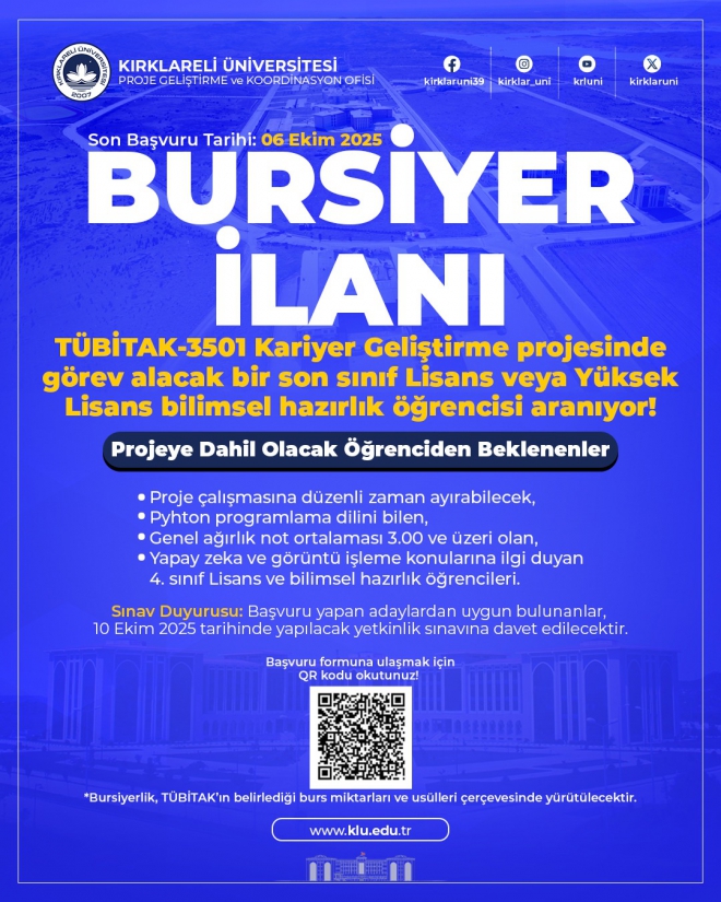 TÜBİTAK-3501 Kariyer Geliştirme projesinde görev alacak bir son sınıf Lisans veya Yüksek Lisans bilimsel hazırlık öğrencisi aranıyor!