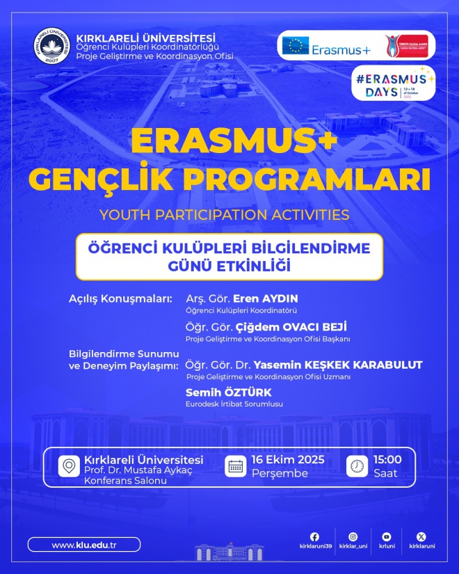Proje Geliştirme ve Koordinasyon Ofisi ile Öğrenci Kulüpleri Koordinatörlüğü İşbirliğinde 16 Ekim 2025, Perşembe saat 15.00 – 17.00 arasında “Erasmus+ Gençlik Programları: Youth Participation Activities Öğrenci Kulüpleri Bilgilendirme Günü” etkinliği Prof. Dr. Mustafa Aykaç Konferans Salonu’nda yüz yüze olarak gerçekleştirilecektir. Etkinliğin program akışı ekte bulunan afişte yer almaktadır.