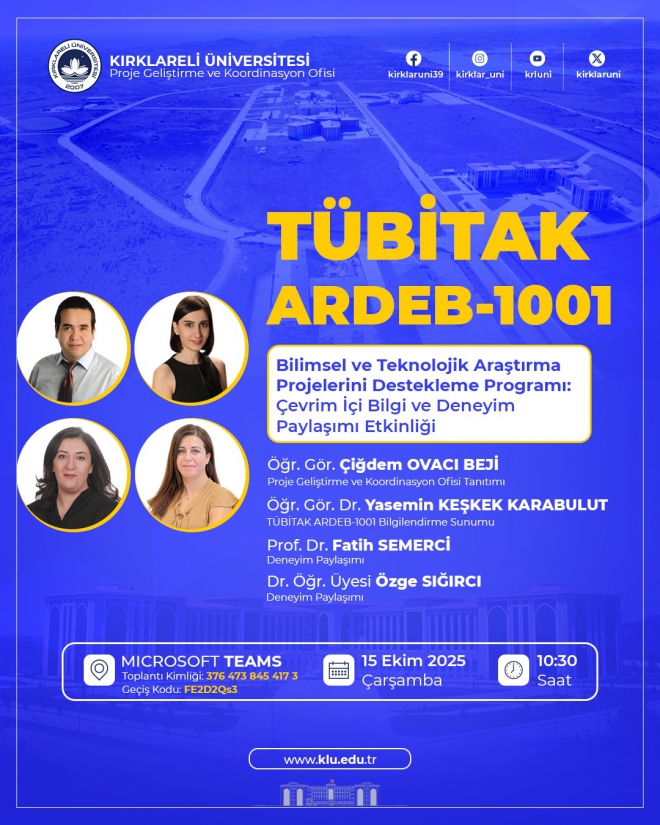Proje Geliştirme ve Koordinasyon Ofisi tarafından 15 Ekim 2025, Çarşamba saat 10:30-12:30 arasında “TÜBİTAK-ARDEB 1001 Bilimsel ve Teknolojik Araştırma Projelerini Destekleme Programı: Bilgi ve Deneyim Paylaşımı" etkinliği çevrim içi olarak gerçekleştirilecektir. Etkinliğin program akışı ekte bulunan afişte yer almaktadır.